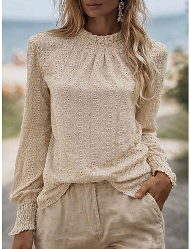 Mujer Camisa de manga corta Camisa casual Blusa Ojal Color sólido Elegante Básico Casual Manga Larga Escote Chino Tops regulares Diario Exterior Festivos Azul Piscina Morado Verde Trébol Albaricoque