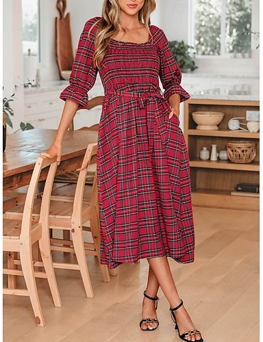 Mujer Vestido Midi Vestido de cuadros Elegante Moda Moderno Diario Exterior Vacaciones Ajuste regular Floral Sin Mangas Escote Cuadrado Rojo Verde Trébol Primavera Otoño
