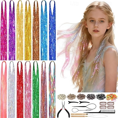Kit de oropel para el cabello para niñas, 14 colores, 48 pulgadas, kit de oropel para el cabello de hadas, extensiones de cabello con brillo de colores resistentes al calor con herramientas para