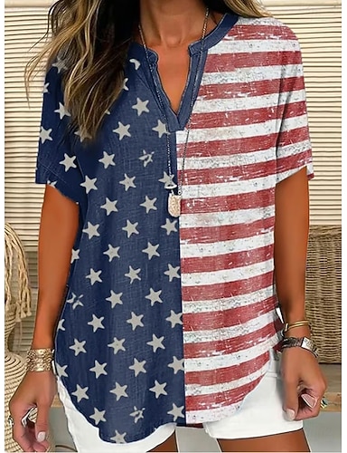 Blusa Patriótica de Día de la Independencia para Mujeres Similar a Lino Transpirable Ligera Gráfica Bandera Vintage Daily Estilo Elegante Manga Corta Cuello en V Tops Regulares Daily Holiday Rojo