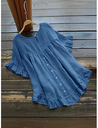 Mujer Blusa Lino de algodón sintético Volante Botones Color sólido Diario Elegante Casual Manga Corta Cuello Barco Tops regulares Diario Azul Piscina Negro Blanco Amarillo Rosa Verano Primavera