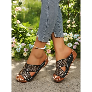 Sandalias de cuña con adornos de diamantes de imitación azules para mujer, cómodas e informales para vacaciones, playa, piscina y uso diario.