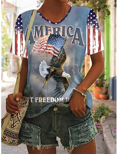 día de la independencia americana Mujer Camiseta Estampado Graphic Bandera Vintage Elegante Clásico Manga Corta Escote en Pico Tops regulares Diario Negro Blanco Rojo Azul Marino Verano Primavera