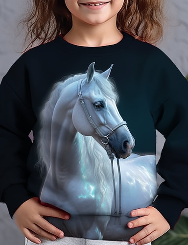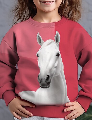 Chica 3D Animal Caballo Camiseta Manga Larga Impresión 3D Otoño Invierno Activo Moda Niños 3-12 años Exterior Diario Ajuste regular