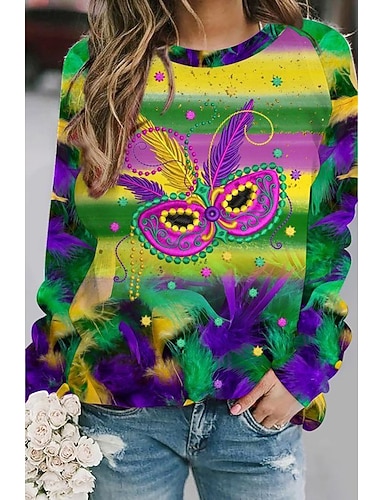 Carnaval Mujer Camiseta Estampado Graphic Vintage Moda Elegante Manga Larga Cuello Barco Escote Redondo Tops regulares Diario Ropa de fiesta de noche Fin de semana Arco Iris Primavera Otoño Invierno