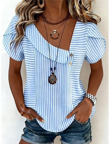 Mujer Camiseta Camiseta superior Estampado A Rayas Moda Elegante Clásico Manga Corta Escote en Pico Tops regulares Diario Noche Fin de semana Azul Piscina Verano Primavera