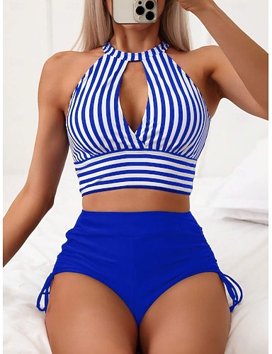 Bikini de dos piezas para mujer color bloque atrevido control de abdomen cintura alta esbelto sin espalda vacaciones playa rayas cuello en V sin mangas