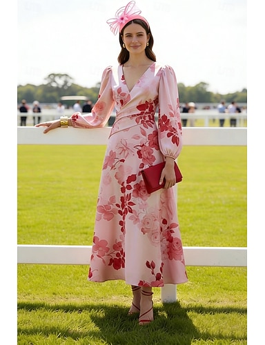 Corte A Hasta el Tobillo Vestidos de coctel Elegante Floral Manga Larga Escote en Pico Fiesta de jardin Boda Satén con Estampado flor