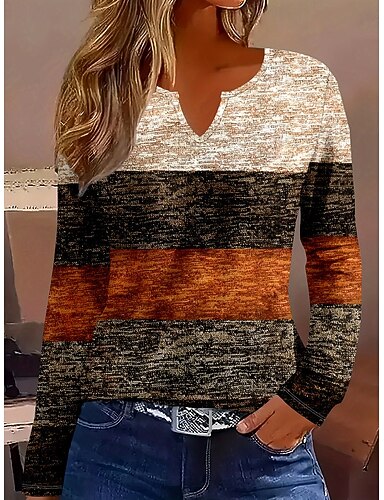 Mujer Camiseta Estampado Graphic Geométrico A Rayas Vintage Elegante Clásico Manga Larga Escote en Pico Cuello con muescas. Tops regulares Diario Fin de semana Marrón Primavera Otoño Invierno