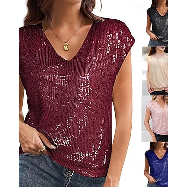 Mujer Camisa Tops con lentejuelas Lentejuelas Plano Vintage Elegante Sin Mangas Escote en Pico Tops regulares Festivos Noche Azul Piscina Negro Champaña Rosa Vino Verano Primavera