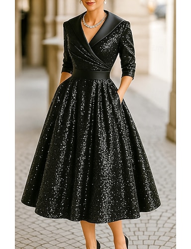 Mujer Vestido de esmoquin Corte A Vestido alto-bajo Formal Satén Lentejuela Elegante 3/4 de Mangas Vestido Midi Longitud midi Solapa Redonda Cremallera