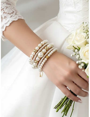 Conjunto de pulseras de perlas apilables elegantes para mujer, 4 piezas, tono dorado, perlas de agua dulce, perfecto para bodas y fiestas