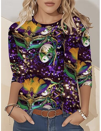 Camiseta de mujer Carnival con gráfico de moda vintage de manga larga cuello redondo tops regulares impresión diaria de fin de semana en púrpura verano primavera otoño