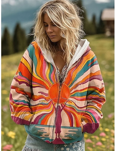 Mujer Sudaderas con cremallera Cremallera Bolsillo Estampado Graphic Geométrico Arco iris Moda Casual Manga Larga Con Capucha Tops regulares Calle Uso Diario Morado Naranja Verde Trébol Primavera