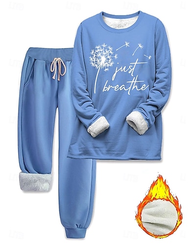 Conjunto de pijamas para mujer forrado de forro polar elegante cálido de moda conjunto de dos piezas chándal pantalones de manga larga manga obispo cuello redondo impresión gráfica de letras al aire