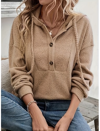 Mujer Pullover Sudaderas Botones Plano Moda Clásico Moderno Manga Larga Con Capucha Tops regulares Calle Uso Diario Azul Piscina Fucsia Color Caquí Gris Primavera Otoño