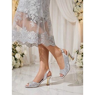 Sandalias de tacón alto de encaje plateado para mujer – sandalias de tacón con tira trasera y punta abierta para cócteles y eventos nocturnos. &invitado a la boda