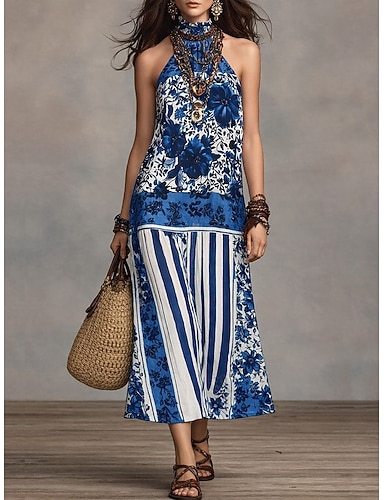 Mujer Vestido maxi Vestido informal Vestido de raso Vestido de Columpio Vestidos Boho Chic Bohemia Vacaciones Tropical Playa Festivos Cita Ajuste regular Floral Sin Mangas Cuello halter Azul Piscina