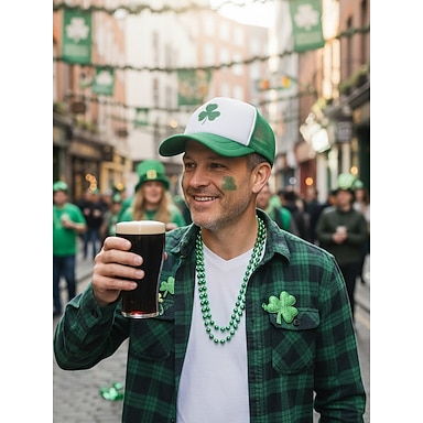 Camisa verde para hombre del Día de San Patricio &Gorra blanca de malla con trébol: una gorra elegante para celebraciones festivas.