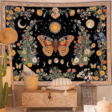 Tapiz de mariposa para colgar en la pared, diseño de sol celestial, luna, estrellas, fases lunares, floral, bohemio, hippie, arte de pared, decoración del hogar para dormitorio y sala de estar