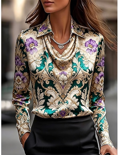 Mujer Camisa Elegant Top de satén Tops de Seda Estampado En Cortina Floral Elegante Vintage Clásico Manga Larga Cuello vuelto holgado Tops regulares Diario Trabajo Festivos Morado Primavera Otoño
