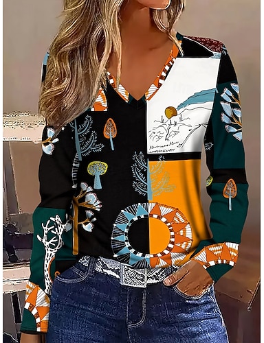 Mujer Camiseta Estampado Ombre Graphic Vintage Elegante Clásico Manga Larga Escote en Pico Tops regulares Diario Azul Piscina Rojo Morado Naranja Verde Trébol Primavera Otoño Invierno