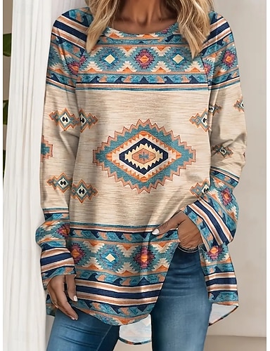 Mujer Camiseta Estampado Graphic Tribal Vintage Elegante Clásico Manga Larga Cuello Barco Escote Redondo Tops largos Diario Azul Piscina Rojo Caqui Primavera Otoño
