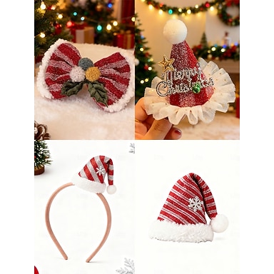 Conjunto de accesorios navideños para el cabello para mujer, conjunto de 4 piezas de diadema navideña y pinza para el cabello con gorro de Papá Noel, lazo y detalles de purpurina para fiestas