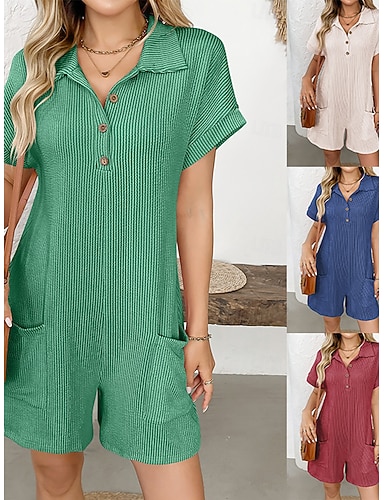 Mujer Mono Activo Color sólido Manga Corta Perneras anchas Cuello Camisero Bolsillo Botones Diario Vacaciones Holgado Azul Piscina Rosa Vino Verano