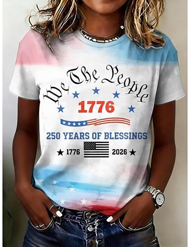 día de la independencia americana Mujer Camiseta Estampado Graphic Bandera Letra Vintage Moda Elegante Manga Corta Cuello Barco Escote Redondo Tops regulares Casual Diario Fin de semana Azul Piscina