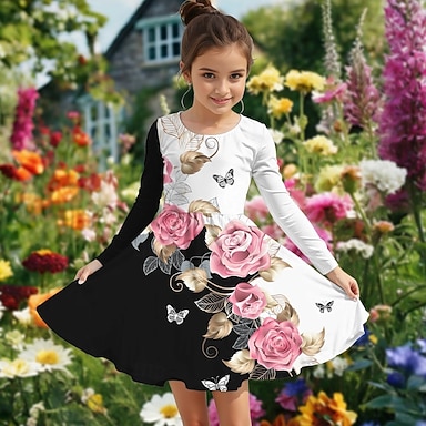 Semana Santa Girls ' 3D Graphic Flor Vestido Manga Larga Verano Primavera Vacaciones Diario Festivos Princesa Hermosa Dulce Niños 4-12 años Vestido informal Vestido de una línea Hasta la Rodilla