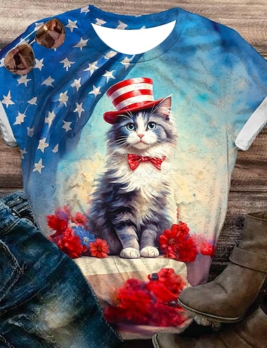 Mujer Camiseta Estampado Graphic Animal Gato Vintage Elegante Clásico Manga Corta Cuello Barco Escote Redondo Tops regulares Diario Fin de semana Azul Piscina Negro Blanco Rojo Morado Verano Primavera