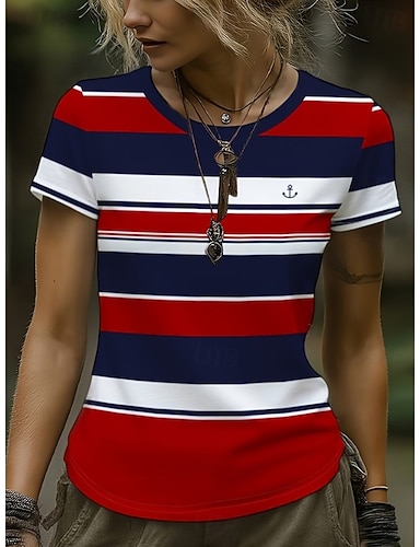 Mujer Camiseta Estampado Graphic Geométrico A Rayas Vintage Elegante Clásico Manga Corta Cuello Barco Tops regulares Diario Azul Piscina Blanco / azul Rosa Verde Ejército Rojo Verano Primavera