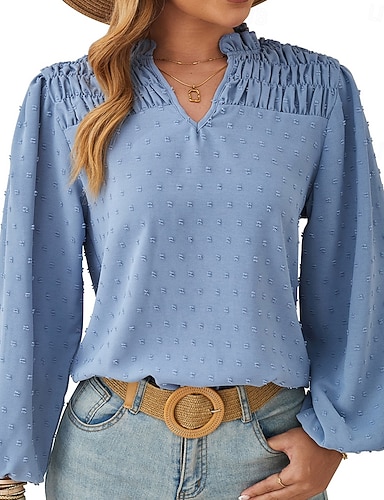 Mujer Camisa Camisa de verano Camisa casual Tops de gasa Frunce Bordado Color sólido Plano Elegante Vacaciones Moda Manga Larga Escote en Pico Tops regulares Diario Festivos Noche Azul Piscina Negro