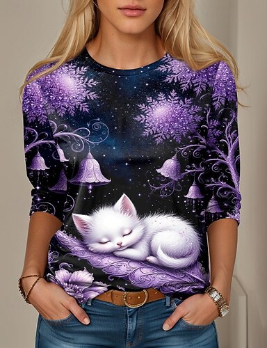 Mujer Camiseta Estampado Graphic Animal Gato Vintage Estilo lindo Elegante Manga Larga Cuello Barco Tops regulares Diario Azul Piscina Rosa Morado Verde Trébol Primavera Otoño Invierno