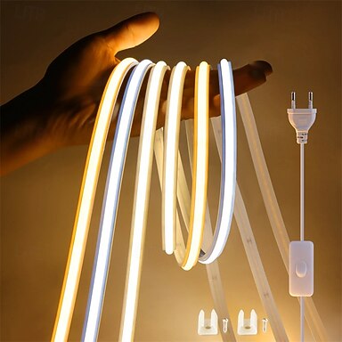 Tira de LED con interruptor de encendido/apagado, resistente al agua, tira de LED COB flexible para iluminación de habitaciones, dormitorios, cocinas y jardines exteriores.