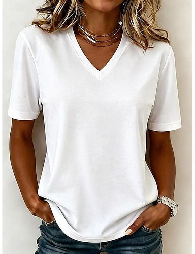 Mujer Camiseta Remera de algodón Camiseta superior Color sólido Moda Elegante Básico Manga Corta Escote en Pico Tops regulares Casual Diario Noche Azul Piscina Blanco Verde Claro Rosa Rojo Verano