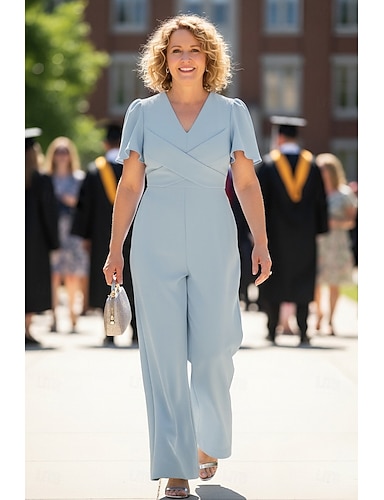 Mono Hasta el Suelo Mono Vestido de Madrina Manga Corta Escote en Pico Elegante Sencillo Invitado a la boda Reunión Familiar Tejido elástico con Cinta / Lazo Un Color