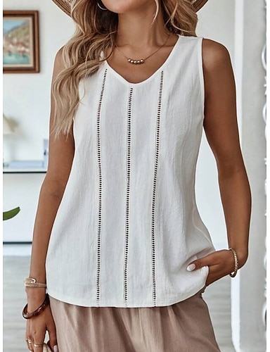 Mujer Camiseta Lino de algodón sintético Camiseta superior Ojal Plano Moda Elegante Clásico Sin Mangas Escote en Pico Tops regulares Diario Noche Fin de semana Azul Piscina Negro Blanco Azul cielo