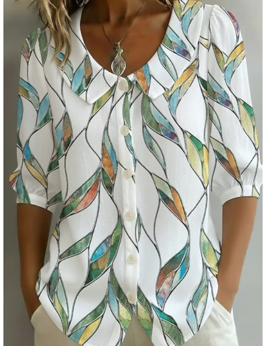 Mujer Camisa Botones Estampado Graphic Geométrico Vintage Elegante Moderno Manga Larga Cuello Camisero Tops regulares Diario Azul Piscina Blanco Rojo Primavera Invierno