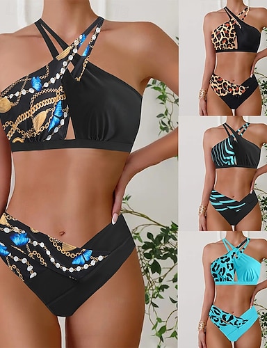 Mujer Bañadores 2 piezas Pícaro Traje de baño Cortado Espalda al Aire Vacaciones Ropa de playa Leopardo Cuello halter Sin Mangas Trajes de baño