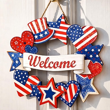 Decoraciones de madera para el 4 de julio, coronas patrióticas para la puerta principal, decoraciones del Día de la Independencia, letrero de estrella de bienvenida, decoración colgante del Día de los