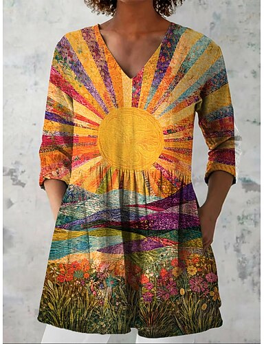 Mujer Blusa Estampado Graphic Sol Vacaciones Diario Casual Manga 3/4 Escote en Pico Tops regulares Diario Festivos Noche Naranja Verano Primavera Otoño