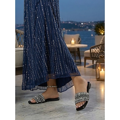 Sandalias planas con cuentas negras para mujer: elegantes zapatos de noche para cenas de vacaciones.