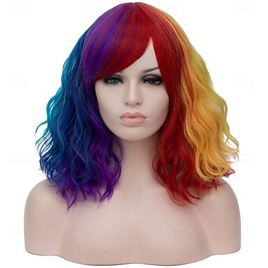 Peluca de carnaval 2026 Rosa Azul Morado Rizado Ondulado Corta Peluca sintética para festival Carnaval Desfile Cabello para disfraz de cosplay para Mujer