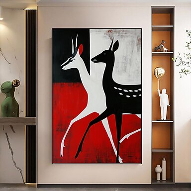 Pintura abstracta de corzo hecha a mano negro blanco rojo animal ciervo lienzo pintura arte de la pared silueta animal pintura arte de la pared decoración minimalista huevas lienzo para sala de estar