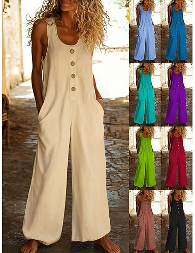 Mono normal para mujer, de lino y algodón sintético, activo, color liso, sin mangas, pierna ancha, cuello en U, bolsillos, botones, para uso diario, vacaciones, corte holgado, azul, negro, azul real,