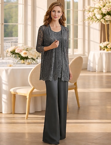 Traje de pantalón Traje de 3 piezas Hasta el Tobillo Vestido de Madrina Media Manga Escote Cuadrado Elegante Formal Invitado a la boda Gasa Encaje con Apliques