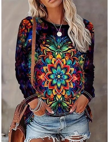Mujer Camiseta Estampado Graphic Mandala Geometría Vintage Elegante Casual Manga Larga Cuello Barco Tops regulares Diario Fin de semana Negro Otoño Invierno