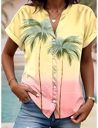 Camisa de mujer con cuello en V blusa con botones tops de verano gráfica ombré árbol tropical diaria hawaiana de manga corta camisa de cuello tops regulares salida diaria botones impresión amarilla